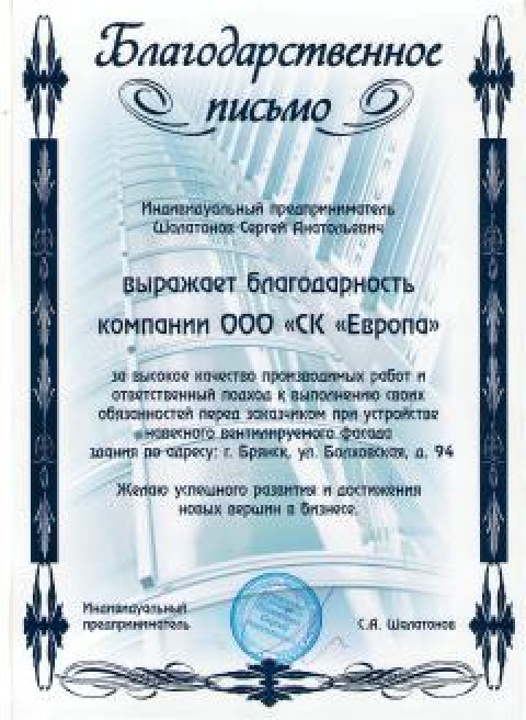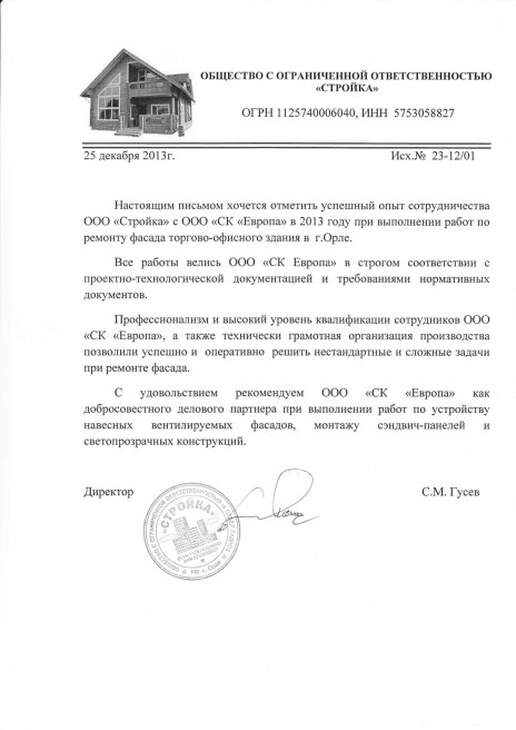 Высокое качество работ, о котором говорят отзывы и рекомендации наших клиентов и партнеров, делает возможным использование для отделки объекта комбинаций из различных видов облицовочных материалов. Сегодня клиентская база Строительной компании «Европа» насчитывает десятки компаний, работающих в различных сферах экономической деятельности.