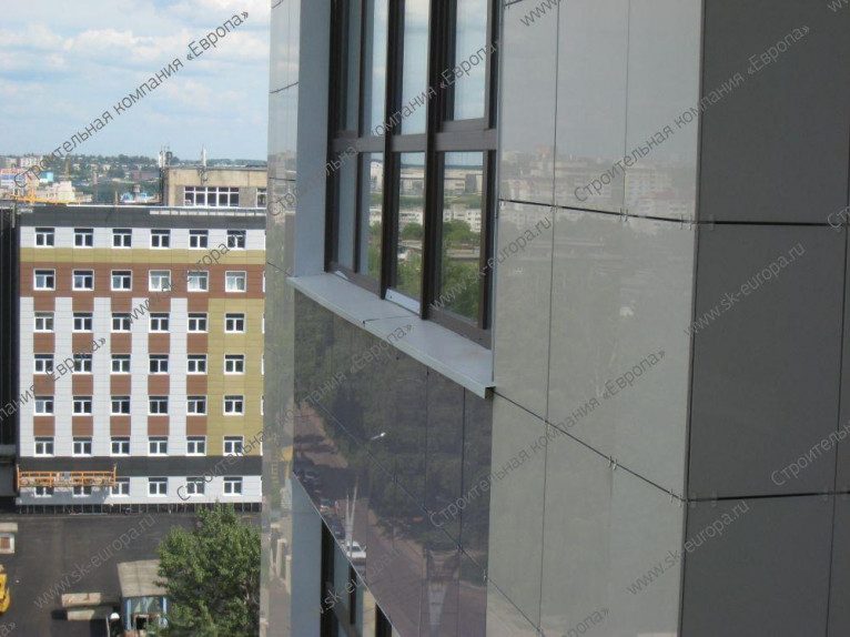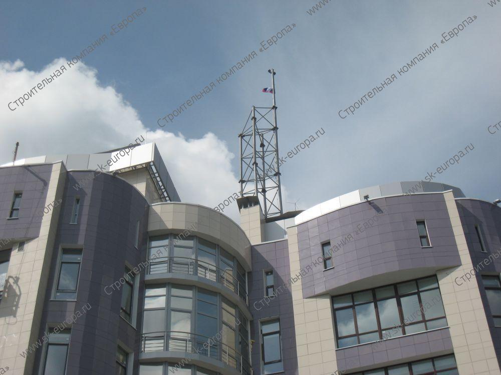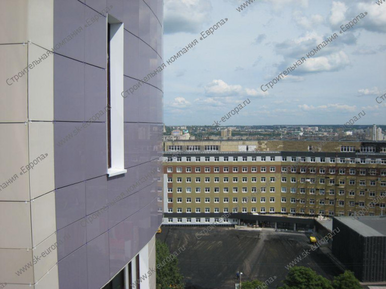 Работы произведены аттестованными сотрудниками Строительной компании «Европа»: монтажниками навесных вентилируемых фасадов и промышленными альпинистами с использованием специального оборудования: строительных лесов клинового типа ЛСК-100 и фасадных подъемников (люлек) ZLP-630 и ZLP-750.